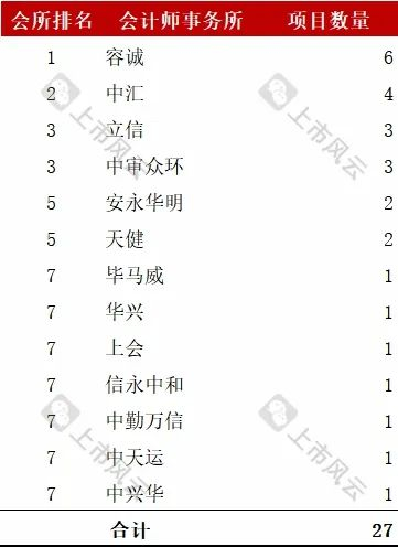 会计师事务所项目数量排名前三的是:容诚以6家项目排名第一;中汇以4家项目排名第二;立信与中审众环以3家项目并列排名第三。