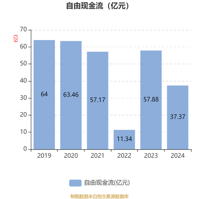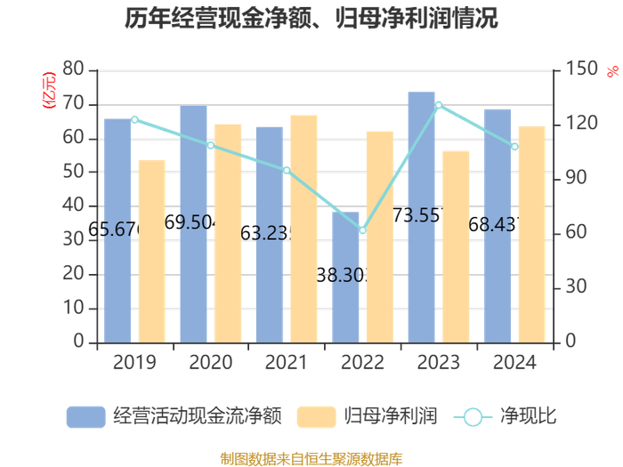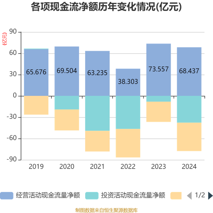 截至2024年,公司经营活动现金流净额为68.44亿元,同比下降6.96%;筹资活动现金流净额-40.02亿元,同比减少11.52亿元;投资活动现金流净额-37.76亿元,上年同期为-8.2亿元。