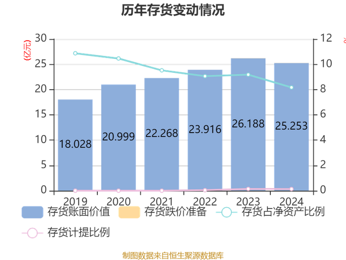 从存货变动来看,截至2024年末,公司存货账面价值为25.25亿元,占净资产的8.17%,较上年末减少9349.94万元。其中,存货跌价准备为327.07万元,计提比例为0.13%。