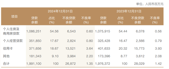 2024年兴业银行个人贷款不良率在下降,从1.42%降至1.35%,但如上图所示,其个人住房及商用房贷款的不利贷款率也在上升。