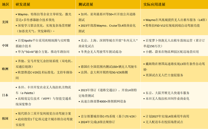 目前,全球自动驾驶技术呈现出显著的区域差异化特征,不同地区在技术研发重点、应用场景以及商业化推进速度等方面都存在差异。