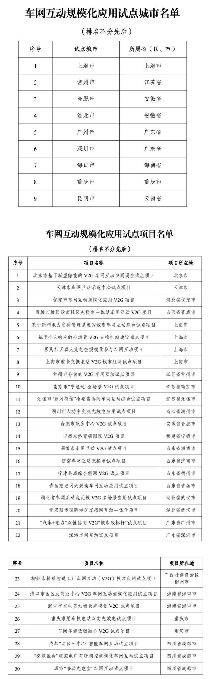 据国家发改委网站消息,近日,国家发展改革委、国家能源局、工业和信息化部、市场监管总局联合发布《关于公布首批车网互动规模化应用试点的通知》。经专家评审,列入首批车网互动规模化应用试点范围的为上海市等9个城市以及“北京市基于新型储能的V2G车网互动协同调控试点项目”等30个项目。