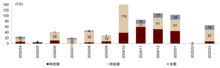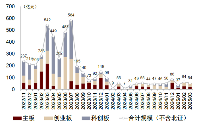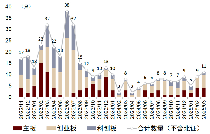 审核与融资:2025年3月,A股IPO数量11只(环比+22%),融资规模54亿元(环比-16%)。年初至今,A股IPO数量合计25只(同比+25%),融资规模合计155亿元(同比-3%)。