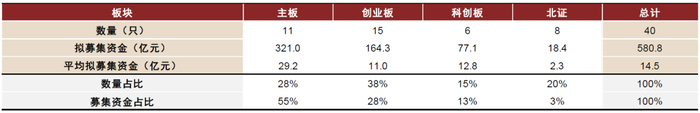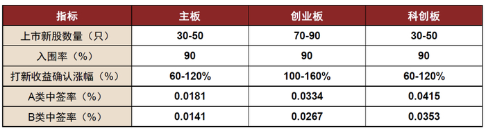 我们依据历史市场变化与当前政策趋势,对各板块的IPO发行节奏与募资规模、网下报价入围率和中签率、首日均价涨幅等相关指标做出如下分析和假设。