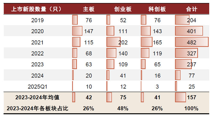 2020-2022年,新股发行节奏来到历史高位,全年上市新股数量在300-500只区间,全年IPO募资规模在4,000-6,000亿元水平。2023年“827新政”[4]以来,IPO节奏阶段性收紧,2023年全年IPO数量降至237家(合计募资规模3,459亿元),2024年进一步下行至77家(合计募资规模575亿元)。2024年“924行情”[5]后,一揽子刺激政策有效提振资本市场投资者信心和活力,与此同时,证监会主席吴清在10月座谈会中提及“逐步实现IPO常态化”[6]。市场开始期待股市转暖后的IPO节奏提速,截至2025年一季度,年初至今IPO数量(不含北证)25只,同比提升25%。