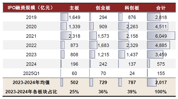 2025年A股IPO节奏或将同比抬升,然而难以回归历史的高速发行模式。我们预计各板块新股发行数量及IPO融资规模或将相较去年稳步抬升,整体节奏有望介于2023与2024年之间水平。