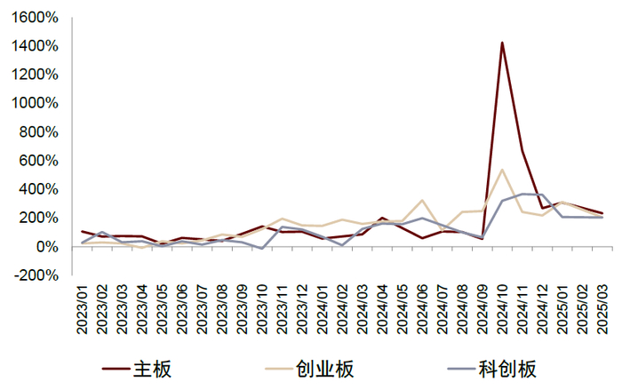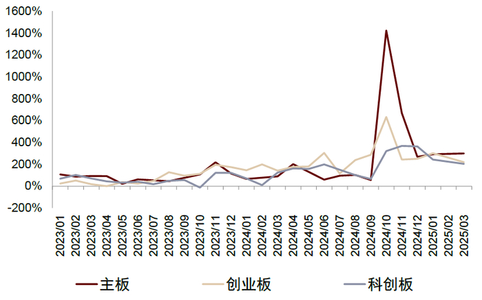 注:1)按上市日统计(核准制发行的主板新股按开板日统计),各月按各板块新股的涨幅中位数统计;2)截至2025/3/31