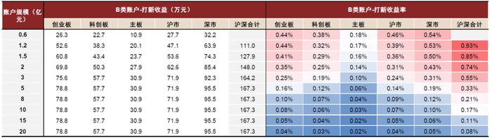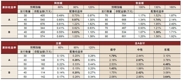 据我们测算,中性假设下,对于2亿元A/B类账户,A股(不含北证,下同)2025年全年打新收益贡献或可达到4.54%/3.69%。对于5亿元A/B类账户,A股2025年全年打新收益有望达到2.97%/2.42%。对于10亿元A/B类账户,A股2025年全年打新收益或可达到1.69%/1.38%。