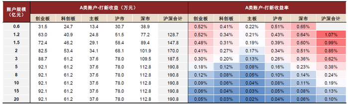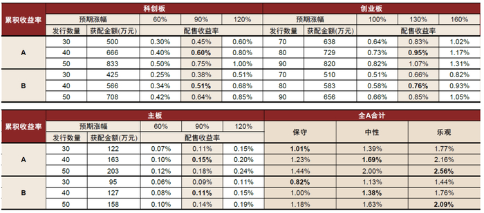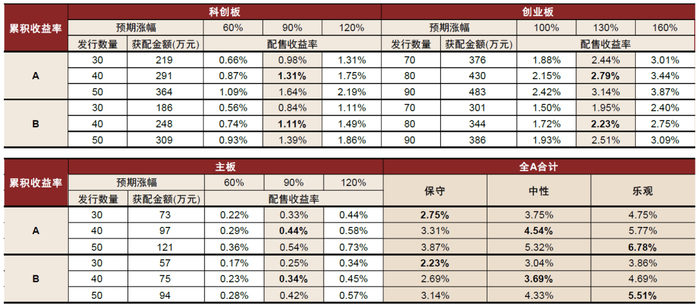 我们沿用上一小节的分析和结论,以不同股票市值账户为例,分别测算不同类型账户对应的2025年全年打新收益贡献。
