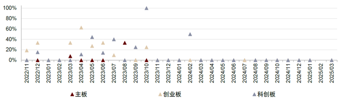 涨幅与收益:2025年3月,新股涨幅仍在高位。本月主板有4只新股上市,首日均价涨幅均值299%,中位数233%;创业板8只新股上市,涨幅均值219%,中位数206%;科创板1只新股上市,首日均价涨幅为204%。中性假设下,以2亿元A类账户为例,2025年以来打新收益170万元,打新收益率0.85%;2亿元B类账户年初至今打新收益148万元,累计收益率0.74%。