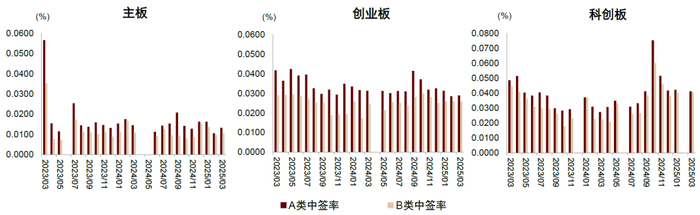 在现行网下投资者分类配售规则之下,公募基金、社保基金、养老金、年金基金、保险资金及保险资管、银行理财、合格境外投资者资金(QFII)均为A类投资者,政策支持下,对上述账户的配售比率给予一定倾斜。2025年一季度,主板新股A/B类账户平均中签率分别为0.0133%/0.0111%,创业板新股A/B类账户平均中签率分别为0.0291%/0.0260%,科创板新股A/B类账户平均中签率分别为0.0419%/0.0404%。