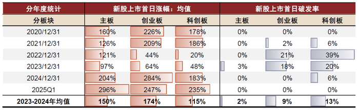 注:1)按上市日统计;2)截至2025/3/31;3)新股破发指上市首日成交均价/开板日成交均价不及新股发行价