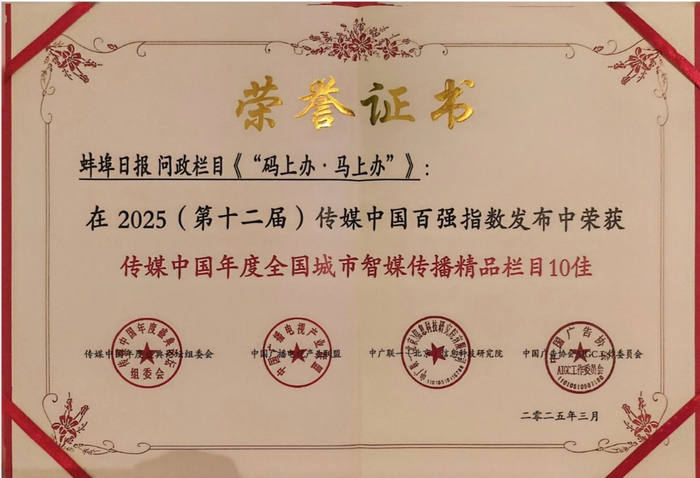 2025(第十二届)传媒中国年度盛典奖项涵盖报刊、广电、新媒体等全媒体领域。其中,蚌埠日报社荣获“2025(第十二届)传媒中国年度全国城市智媒传播建设优秀单位”称号;蚌埠日报社党委副书记、总编辑孟儒存荣获“传媒中国年度全国智媒传播贡献人物”称号;“蚌埠发布·新媒问政”荣获“传媒中国年度全国城市智媒传播创新案例10佳”称号;《码上办·马上办》荣获“传媒中国年度全国城市智媒传播精品栏目10佳”称号。