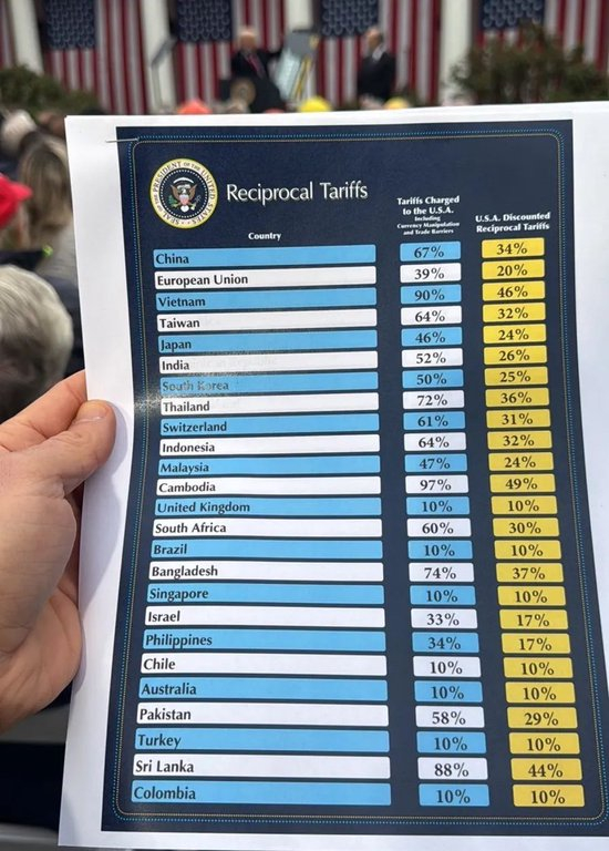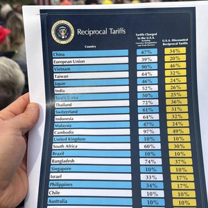中国:34%、欧盟:20%、越南:46%、台湾:32%、日本:24%、印度:26%、韩国:25%、泰国:36%、瑞士:31%、印度尼西亚:32%、马来西亚:24%、英国:10%、柬埔寨: 49%、南非:30%、巴西:10%、孟加拉国:37%、新加坡:10%、以色列:17%、菲律宾:17%、智利:10%