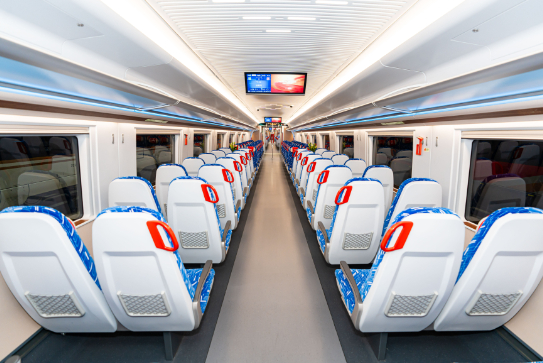 智慧舒适。列车搭载智能服务系统,采用全数字以太网通讯和5G网络技术,实现车内Wi-Fi覆盖、电视直播、旅客信息智能交互等全场景智能化运用。值得一提的是,列车首次应用智慧车窗,可根据不同场景实现信息个性化显示和更融洽的人机交互体验。