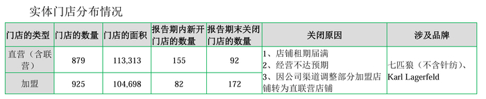 门店方面,报告期内,七匹狼新开门店237家,关闭门店264家。其中,公司加盟店新开82家,关闭172家,净减少90家。七匹狼表示,店铺关闭原因包括店铺租期届满、经营不达预期、公司渠道调整等。
