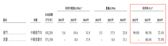 重庆生产基地从2023年启用,2023年和2024年的产能利用率分别为88.4%和73.3%。