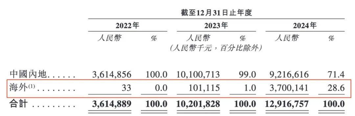 从不同地域贡献营收看,报告期内公司在中国内地的营收分别约为36.15亿元、101亿元和92.17亿元,营收占比分别为100%、99%和71.4%。海外营收分别约为3.3万元、1.01亿元和37亿元,营收占比分别为0、1%和28.6%。