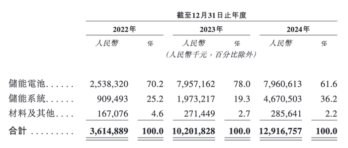其中,储能电池的营收分别约为25.38亿元、79.57亿元、79.61亿元,营收占比分别为70.2%、78%和61.6%。