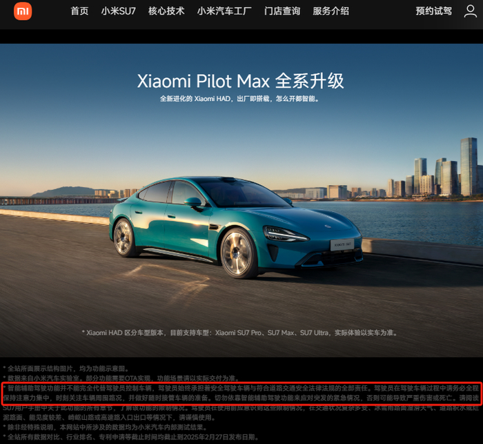 《华夏时报》记者登录小米汽车官网发现,其在智能驾驶页面最下用方小字写道:“智能辅助驾驶功能并不能完全代替驾驶员控制车辆,驾驶员始终承担着安全驾驶车辆与符合道路交通安全法律法规的全部责任。驾驶员在驾驶车辆过程中请务必全程保持注意力集中,时刻关注车辆周围路况,并做好随时接管车辆的准备。切勿依靠智能辅助驾驶功能来应对突发的紧急情况,否则可能导致严重伤害或死亡。”
