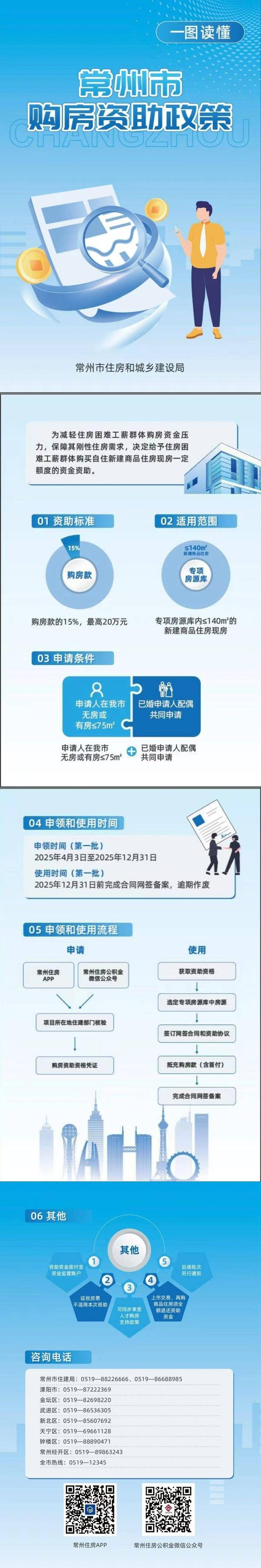 为更多人在常就业创业、扎根常州、安居常州,常州推出支持住房困难工薪群体购房政策,进一步降低购房门槛,减轻住房困难工薪群体购房资金压力,助力在常安居乐业。4月2日,常州举行支持购买刚性需求住房政策吹风会。据常州市住建部门相关负责人介绍,本次购房资助政策覆盖面广,支持力度大,选择房源多。其中资助资金最高可达20万元,为住房困难工薪群体购房提供实实在在的帮助。该项政策自4月3日起施行,第一批购房资助执行至2025年12月31日(以新建商品住房合同网签备案时间为准),后续批次购房资助事宜另行通知。