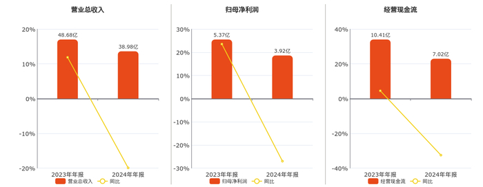 公司营业总收入为38.98亿元,较去年同报告期营业总收入减少9.66亿元,同比较去年同期下降19.86%。归母净利润为3.92亿元,较去年同报告期归母净利润减少7229.41万元,同比较去年同期下降15.58%。经营活动现金净流入为7.02亿元,较去年同报告期经营活动现金净流入减少2.70亿元,同比较去年同期下降27.75%。