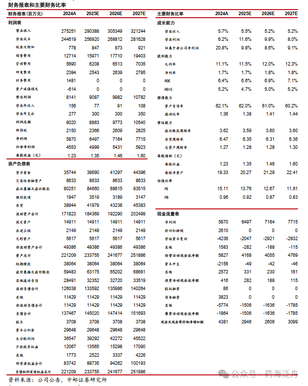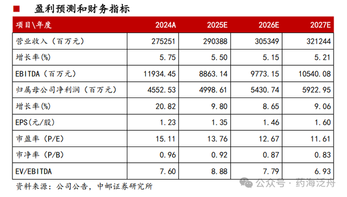 我们预计公司2025-2027年实现归母净利润分别为49.99/54.31/59.23亿元,对应EPS分别为1.35/1.46/1.60元,当前股价对应PE分别为14/13/12倍,维持“买入”评级。