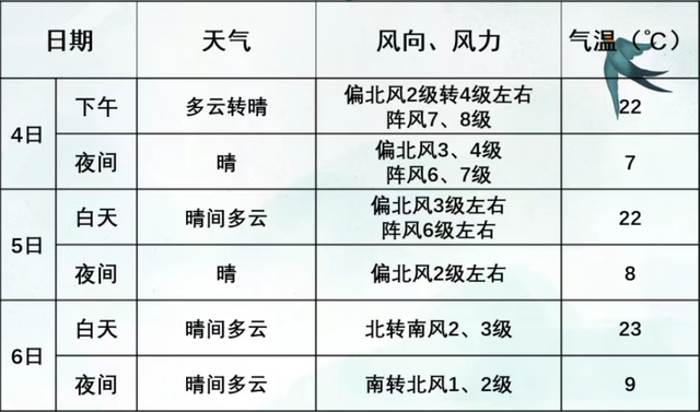 根据气象部门预报,预计清明节期间(4月4日至6日),我市天气为晴到多云,能见度总体较好。受冷空气影响,4日有4级左右偏北风,阵风7、8级;5日白天仍有3级左右偏北风,阵风6级左右。气温较平稳,白天最高气温22~23℃,夜间最低气温7~9℃。天气情况总体较适宜交通出行。