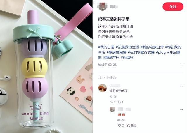 除颜值外,该产品730ml超大容量与“一杯两用”(可切换吸管杯与马克杯模式)以及自带超大茶仓和防尘盖等设计也备受认可,满足了日常通勤、聚会野餐等多种场景需求,消费者们纷纷发挥创意,将其用于装载冰咖啡、奶茶,更有用户开发出泡面杯等新奇用法,开启"一杯解锁N种生活方式"的春日风潮。