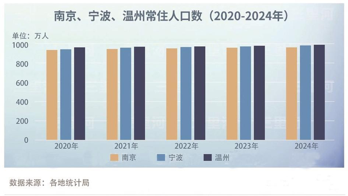 从近期各城市公布的2024年常住人口数据看,温州、宁波、南京、济南均超过950万人,分别为985.2万人、977.7万人、957.7万人和951.5万人。