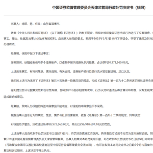 近日,天津证监局公布了一则行政处罚决定书,对股民徐阳操纵证券市场的违法行为作出严厉处罚,合计罚没金额近4亿元。