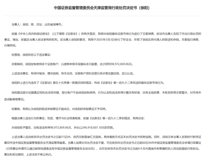 天津证监局称,经查明,徐阳存在以下违法事实:涉案期间,徐阳控制使用多个证券账户,以虚假申报手段操纵多只股票,合计获利9897.29万元。上述违法事实,有询问笔录、情况说明、有关合同、证券账户资料及银行流水等证据证明,足以认定。
