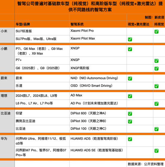 高阶智驾才有激光雷达,基础版智驾没有,小米、蔚来、华为、比亚迪都是这种方案;