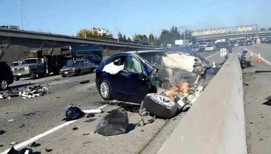 事故:一辆特斯拉Model X在高速公路的左出口岔路口与受损的护栏相撞,汽车起火,后又被后方驶来的一辆马自达和一辆奥迪相继撞上,特斯拉司机被送到医院后不治死亡。