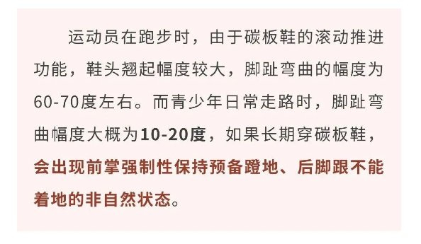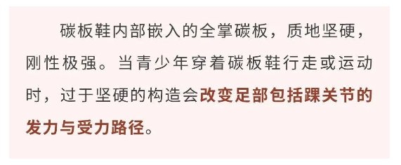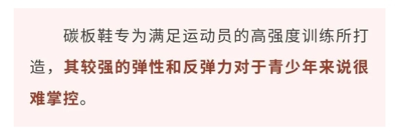 碳板鞋的特殊构造,还会使青少年在应对行走、上下楼梯、跳跃等丰富多样的日常动作时,无法像普通鞋子那样灵活适配,导致行动协调性与舒适性大幅下降,提升了意外受伤的可能性。
