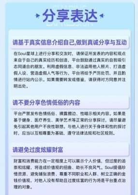 内容真实性是影响用户体验的关键因素之一。因此,Soul App一直鼓励用户通过真实分享建立情感连接。此次发布的《社区公约》特别强调“真诚分享”原则,要求用户基于真实经历进行内容创作,倡导用户积极传播多元文化、职业故事、生活感悟等优质内容。为进一步优化社交氛围,平台明确禁止低俗内容、恶意营销和过度炫富等行为。在科学传播方面,公约也明确规定,涉及医疗、经济等专业领域的内容需基于科学依据,严禁散布未经验证的信息,以保障平台内容的真实性。