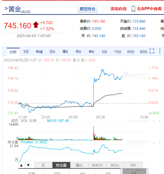 上海黄金交易所现货黄金,盘中最高价一度超过747元/克。