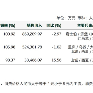 反观,只有4元以下的经济产品销售收入同比增长15.56%,但该部分占比较小,销售收入为3.35亿元。