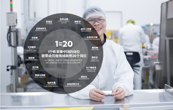 据法国知名的独立经济咨询公司Asterès统计,欧莱雅在中国直接或间接提供就业岗位超33万,相当于每一个欧莱雅中国的岗位,可以带动其他领域新增20个岗位,是中国全行业平均就业乘数的8倍。