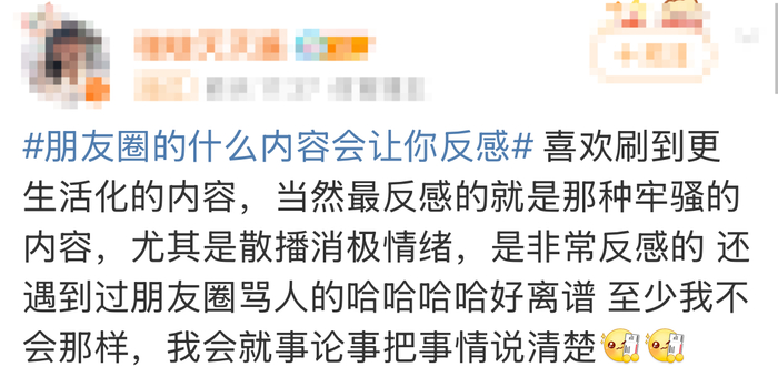 有人说,现在朋友圈里鲜活的记录好像越来越少了。近日,话题#朋友圈的什么内容会让你反感#引发网友热议。