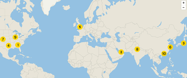 美国四座机场上榜(ATL、DFW、DEN、ORD),合计占前十总座位数的39.8%。
