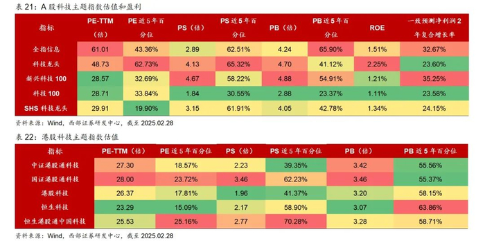截至2025年2月28日,全指信息、科技龙头、新兴科技100、科技100、SHS科技龙头的PE分别为61.01倍、48.73倍、28.57倍、28.71倍、29.91倍,仅科技龙头PE近5年百分位超60%,其余均在50%以内。新兴科技100和科技龙头的PS较高,分别为4.67、4.13;科技100的PS处于近5年30.55%百分位。中证港股通科技、国证港股通科技、港股科技、恒生科技、恒生港股通中国科技的PE分别为27.30倍、28.00倍、26.37倍、23.29倍、25.53倍,近5年百分位均处于30%以内。