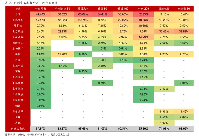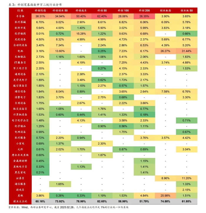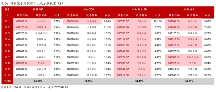 8个科创宽基指数分布在约50个申万二级行业,因科创综指成分股多、涵盖广。对比来看,1)8个指数均有的行业为半导体、医疗器械、软件开发、光伏设备;2)创业板指和创业板50的第一大行业为电池,其余指数的第一大行业为半导体,尤其是科创50、科创成长的半导体占比均超50%,但创业板指/创业板50半导体占比均不到4%;3)创业板相关指数主要分布在电池、证券Ⅱ、通信设备,科创板相关指数主要分布在半导体。