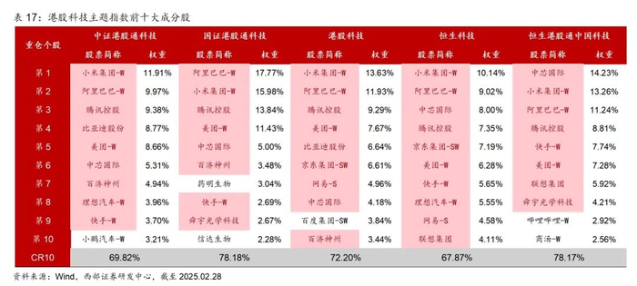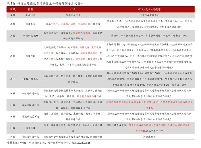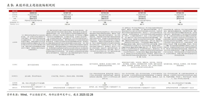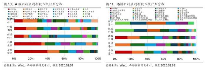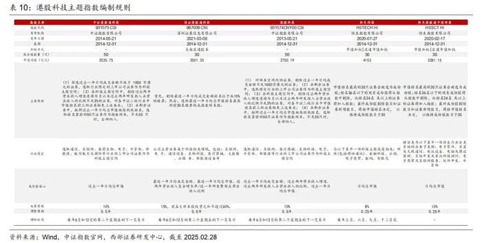 对比这10只指数的编制规则可以发现,1)在样本遴选条件上,针对A股和港股的要求不同,普遍重视流动性和总市值,部分对股东质押有要求;2)对于行业范围均有明确约定,多数聚焦在信息技术、电子、计算机、通信、生物科技、医疗器械、互联网和半导体等,部分指数如科技100、新兴科技100、中证港股通科技涵盖航空航天与国防、电网设备、储能设备、光伏设备、风电设备等新兴科技领域。全指信息则范围最广;3)加权方式上,全指信息、科技100、恒生科技、恒生港股通中国科技均采用自由流通市值加权,新兴科技100采用基本面加权,其余则为市值排名方式筛选;4)从对研发、成长、盈利等约定指标来看,除全指信息、新兴科技100这2个指数外均关注研发投入。港股市场的科技主题指数均采用绝对指标,A股为主的科技主题指数多采用相对排名指标。国证港股通科技要求最高,其次为恒生科技和恒生港股通中国科技、中证港股通科技和港股科技。A股市场上全指信息不考虑研发及营收能力,其余几个指数均要求市盈率大于0、过去三年研发投入复合增长率大于0等,并对基本面指标等均有筛选条件;5)均对单个样本权重进行限制,其中全指信息和国证港股通科技限制最为宽松,均为15%,科技100限制最为严格,为5%。全指信息、SHS科技龙头和国证港股通科技还对前五大样本权重进行了限制,分别不超过60%、40%、60%;6)新兴科技100、恒生科技、恒生港股通中国科技每季度调整一次,其余均为半年一次。