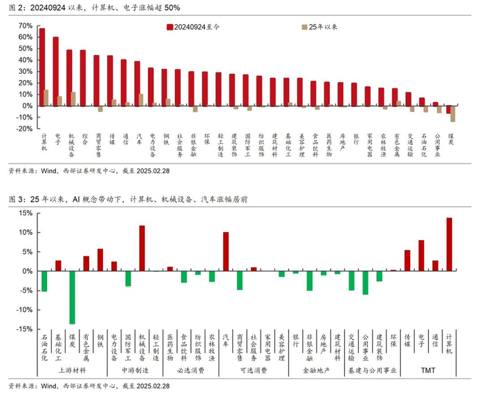 申万一级行业来看,自2024年9月24日以来,计算机、电子涨幅分别为67.07%、59.66%,25年以来表现最强的行业也是计算机,涨幅达13.79%。在人工智能概念引领下,涉及算力、机器人、智能驾驶等板块的机械设备、汽车、电力设备从2024年9月24日至今涨幅均超30%,尤其是机械设备、汽车在25年以来涨幅也均超10%。