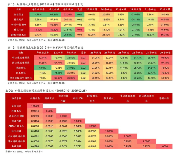由于多数港股科技指数的基期为2014.12.31,我们选择2015年至今(截至2025.02.28,下同)区间来看。A股市场中,全指信息、科技龙头、新兴科技100、科技100、SHS科技龙头区间年化收益率分别为4.78%、7.68%、8.55%、11.40%、9.43%,其中科技100表现最好;区间最大回撤上,全指信息较大,科技100较小;波动率上,全指信息较大,SHS科技龙头较小。港股指数中,中证港股通科技、国证港股通科技、港股科技、恒生科技、恒生港股通中国科技区间年化收益率分别为12.74%、11.85%、6.94%、7.45%、7.50%,中证港股通科技表现最好;区间最大回撤上,均超66%,回撤较A股科技主题指数较大。