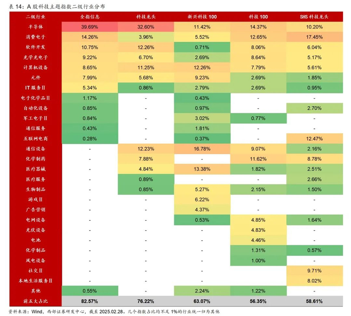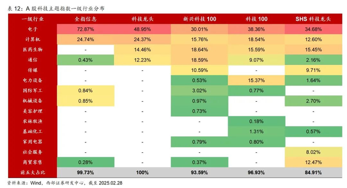 全指信息前五大行业为电子、计算机、机械设备、国防军工、通信,占比分别为72.87%、24.74%、0.85%、0.84%、0.43%,电子和计算机占据主导地位,合计占比97.61%。科技龙头前四大行业为电子、计算机、医药生物、通信,占比分别为48.95%、24.37%、14.46%、12.23%,电子和计算机为主,但相对均衡。新兴科技100前五大行业为电子、医药生物、通信、计算机、传媒,占比分别为30.01%、18.64%、18.59%、15.76%、10.59%,医药生物和传媒相对其他指数较高。科技100前五大行业为电子、计算机、医药生物、电力设备、通信,占比分别为38.36%、18.54%、15.59%、15.37%、9.07%,电力设备相对其他指数较高。SHS科技龙头前五大行业为电子、医药生物、计算机、商贸零售、传媒,占比分别为34.68%、15.45%、12.60%、12.47%、9.71%,商贸零售相对其他指数较高,行业分布较为分散。