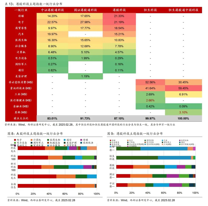 2、 科技主题指数上,1)科技100、新兴科技100、中证港股通科技行业涵盖新兴科技领域;2)对研发、成长、盈利等指标要求不同,除全指信息、新兴科技100这2个指数外均关注研发投入,国证港股通科技要求最高,其次为恒生科技和恒生港股通中国科技、中证港股通科技和港股科技;3)行业分布上,A股指数主要在电子和计算机,细分看是半导体、消费电子、软件开发、光学光电子、计算机设备等,更偏向硬科技;港股指数主要在资讯科技业和非必需性消费,细分看是消费电子、互联网电商、社交、本地生活服务等,更偏向应用端;4)从成分股来看,互联网应用端个股主要在港股;5)港股科技指数历史业绩更优,目前估值较低。建议重点关注港股科技主题指数,除恒生科技外,可关注中证港股通科技。
