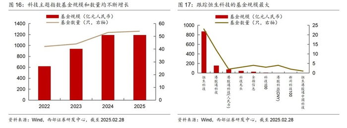 对于科技主题指数,目前没有跟踪SHS科技龙头的指数基金,跟踪恒生科技的指数基金规模和数量均居首。从2022年以来(截至2025.02.28,下同),科技主题指数基金规模和数量不断增加。2022年末,科技主题类指数基金42只,规模为621.11亿元人民币,截至2025.02.28,科技主题指数基金数量和规模分别增长至54只、1193.19亿元人民币,增速分别为29%、92%。