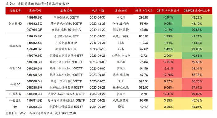 跟踪科创200的基金均成立于2024年12月之后,目前规模较小,包括华泰柏瑞、华夏和鹏华;跟踪科创综指的基金均成立于2025年,目前有10只,规模都在10亿以上,包括华夏、华泰柏瑞、南方、招商等10家管理人;跟踪创业板50、科创成长的基金中没有增强策略、跟踪科创100的基金有增强策略产品但不足一年、跟踪科创50的有增强策略基金但业绩优势不明显。在此基础上,我们建议关注如下基金,包括:1)易方达、广发和南方的创业板ETF,富国创业板增强策略ETF;2)华安、景顺长城的科创板50ETF,交银创业板50指数;3)博时、鹏华、银华科创板100ETF;4)华夏、易方达科创50ETF;5)易方达科创成长ETF;6)易方达、华夏的科创创业50ETF。